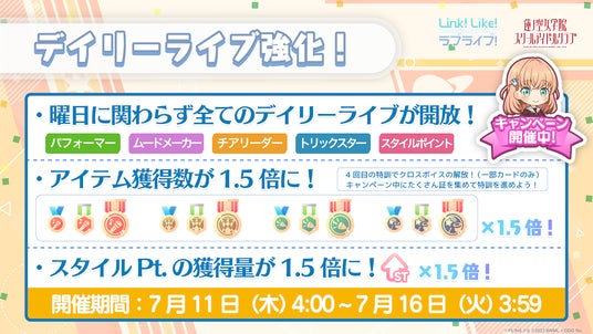 期間中、曜日に関わらず全てのデイリーライブを開放!アイテムの獲得数が1.5倍及びスタイルPt.の獲得量が1.5倍になります。