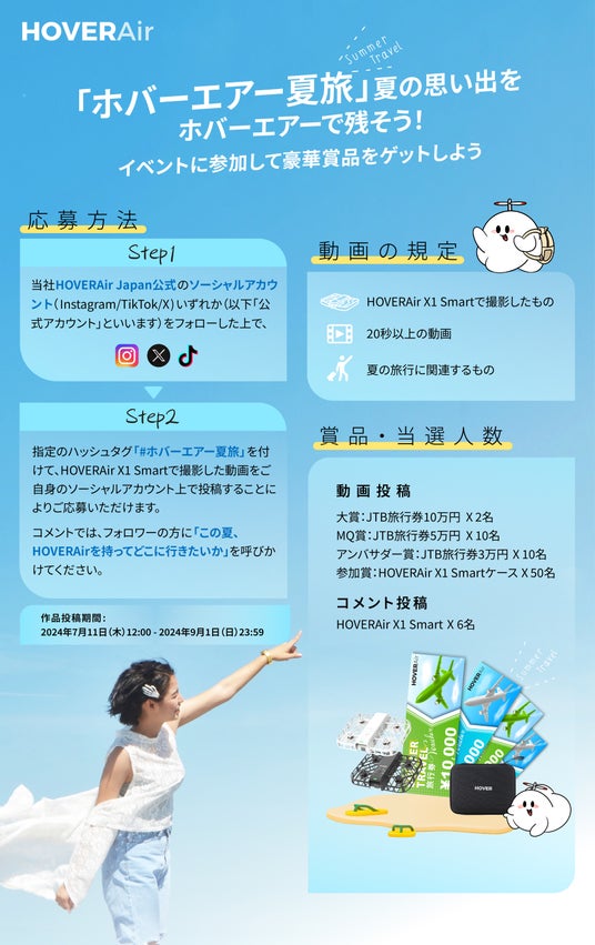当社HOVERAir Japan公式のソーシャルアカウント(Instagram/TikTok/X)いずれか(以下「公式アカウント」といいます)をフォローした上で、指定のハッシュタグ「#ホバーエアー夏旅」を付けて、HOVERAir X1 Smartで撮影した動画をご自身のソーシャルアカウント上で投稿することによりご応募いただけます。コメントでは、フォロワーの方に「この夏、HOVERAirを持ってどこに行きたいか」を呼びかけてください。
