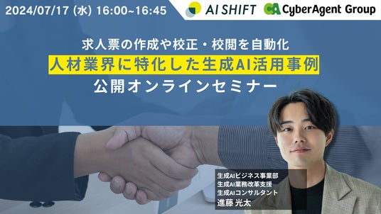 株式会社サイバーエージェント(本社:東京都渋谷区、代表取締役:藤田晋、東証プライム市場:証券コード4751)の100%子会社で、生成AIを活用し業務改革を推進する株式会社AI Shift(本社:東京都渋谷区、代表取締役社長:米山結人)は、企業の業務課題に合わせて生成AIの活用を支援する「AIシフトサービス」について、人材業界での活用事例を紹介するセミナーを開催いたします。オンラインでの開催となりますので、お気軽にご参加ください。