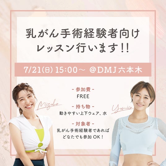 女性の癌発生率1位である乳がん。乳がん摘出手術後、どんな運動をしたらいいか悩んでいる方が多くいらっしゃいます。そんな方に向けて、無料のレッスンを行います!