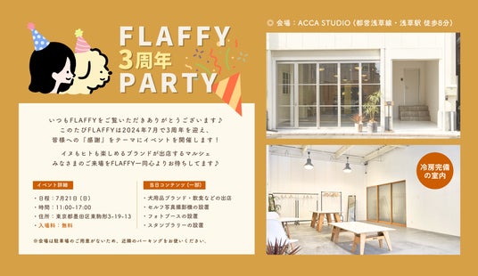 FLAFFYは多くのユーザーさま、クライアントさまに支えられ今年で3周年を迎えることができました。この節目に、みなさまへ「感謝」をテーマとした3周年PARTYを浅草で開催することを決定しました。本イベントでは、イヌとヒトが楽しめる3周年限定イベントコンテンツやFLAFFY公式グッズの販売を実施します。