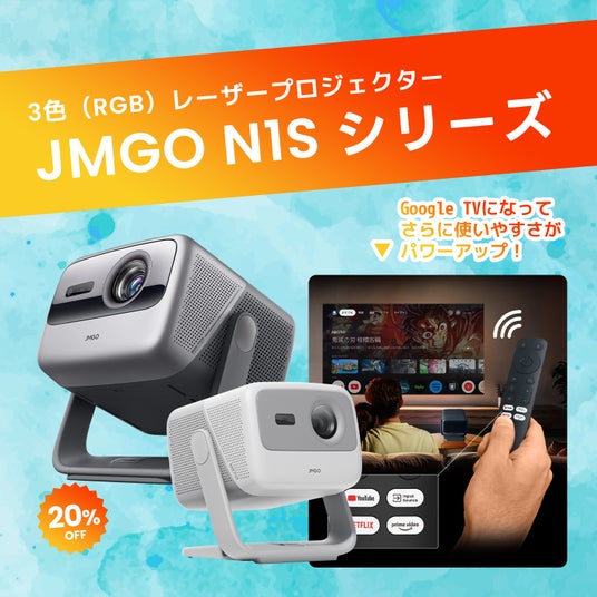JMGO N1Sシリーズ 20%OFF3色レーザー、ジンバル一体型、超速台形補正・オートフォーカス、Google TV搭載の大人気プロジェクター最新モデル
