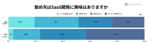 SaaSを認知している経営者・経営企画・BizdevやSaaS系エンジニア、非SaaS系エンジニアにおいて、「勤め先はSaaS開発に興味はありますか」という設問に対し「とても興味がある/興味がある」と回答した割合は、売上が成長基調にある企業が51.5%、そうでない企業が23.2%となっており、特に成長基調にある企業においてSaaS開発への関心が高い傾向にあることが分かりました。
