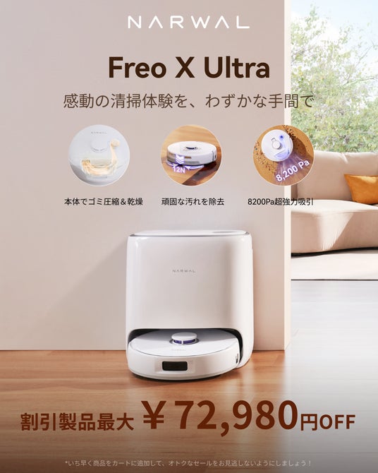 ※アクセサリーコードに関する補足説明:販売チャンネルの施策に制限がございますので、「Narwal Freo」&「Freo X Ultra」のアクセサリーセット及び「Freo X Ultra」のモップパッドは割引コード適用対象外です。