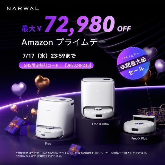 Narwal Japan株式会社(東京都中央区)は、2024年7月11日(木)から7月17日(水)の期間、Amazonプライムデーセールに参加しています。この期間、同社の5月に発売された新製品Freo X Ultra、Freo X Plus、それぞれの掃除機ロボットがセール対象、そして根強い人気のNarwal Freoも史上最安値で販売されます。この機会をお見逃しなきよう、是非、AMAZON プライムデー セール会場をご覧ください。