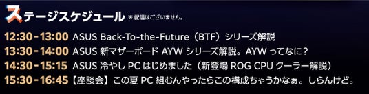 ステージでは、ASUS Back-To-the-Future (BTF) シリーズや新マザーボード AYW シリーズ、新登場のROG CPUクーラーシリーズの解説に加え、スペシャルゲストをお招きしての座談会も予定しております。