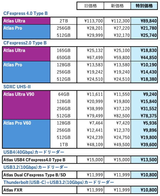 Other World Computing, Inc.(OWC:米国イリノイ州ウッドストック)は、本日Atlasシリーズのメモリカード、カードリーダーの一部製品の価格変更をいたしました。また同時に7月12日(金)12時から7月17日(水)23時59分の期間でアマゾンOWC直営公式ストアでこれらの製品を特別価格にて販売をしております。(期間内でも在庫がなくなり次第終となります)