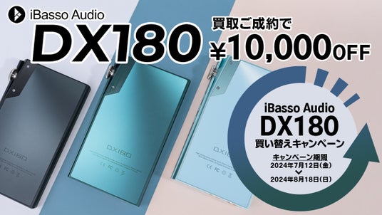 株式会社MUSINは「iBassoAudio DX180」の販売を機に、2024年7月12日~2024年8月18日の期間にて、対象店舗にて買取サービスをご利用いただき、DX180をご成約をいただいたお客様を対象として「DX180(各色) が10,000円OFF」となる買い替えキャンペーンを実施いたします。
