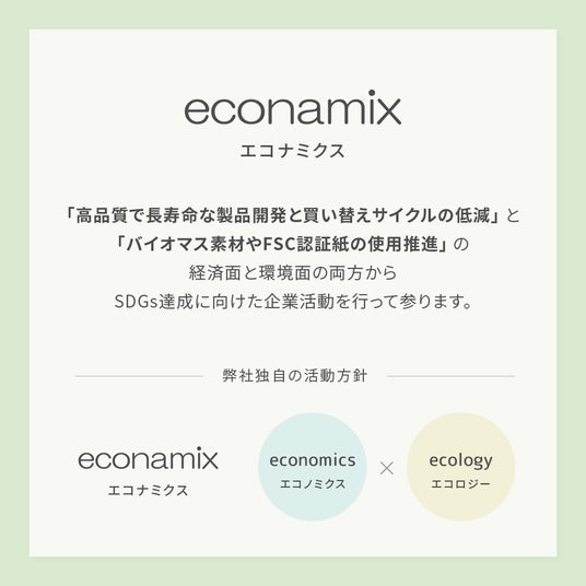 『econamix(エコナミクス)』は「economics(エコノミクス)」と「ecology(エコロジー)」をミックスした、弊社独自の造語であり活動方針です。「高品質な製品・サービスによる、モノを長く使う生活&買い替えサイクルの低減」と「バイオマス素材やFSC認証を取得したパッケージなどの使用推進」を両立し、経済面と環境面の両方からSDGs達成に向けて、企業理念に基づく活動を行って参ります。