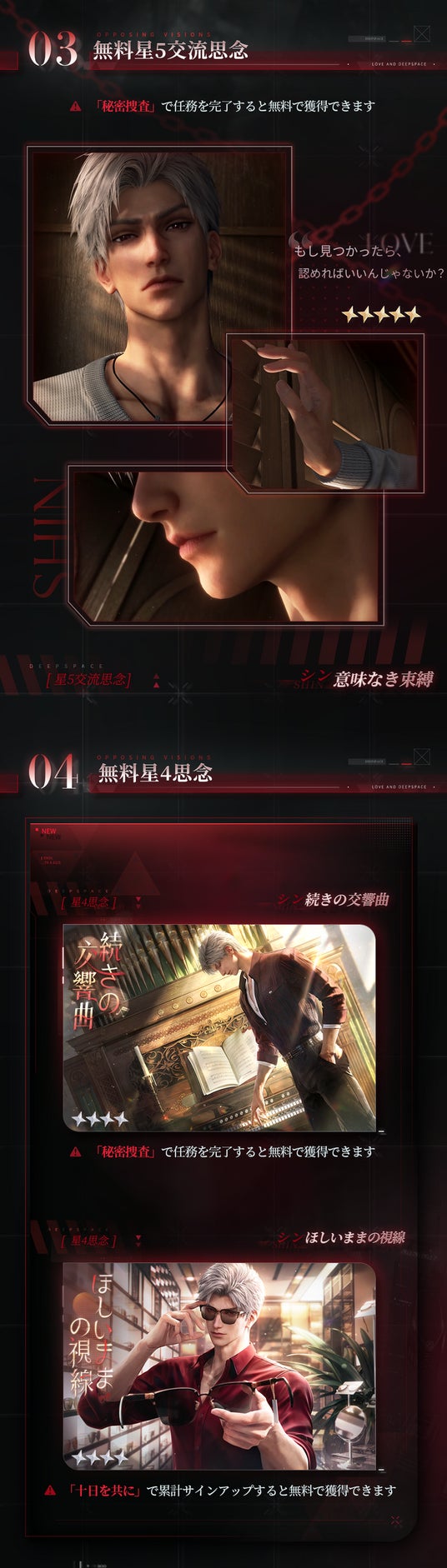 「秘密捜査」で任務を完了すると無料で星5思念【シン・意味なき束縛】、星4思念【シン・続きの交響曲】、【時空を超える】シリーズ衣装、写真動くポーズ、【極空願い券x10】などを獲得できます。