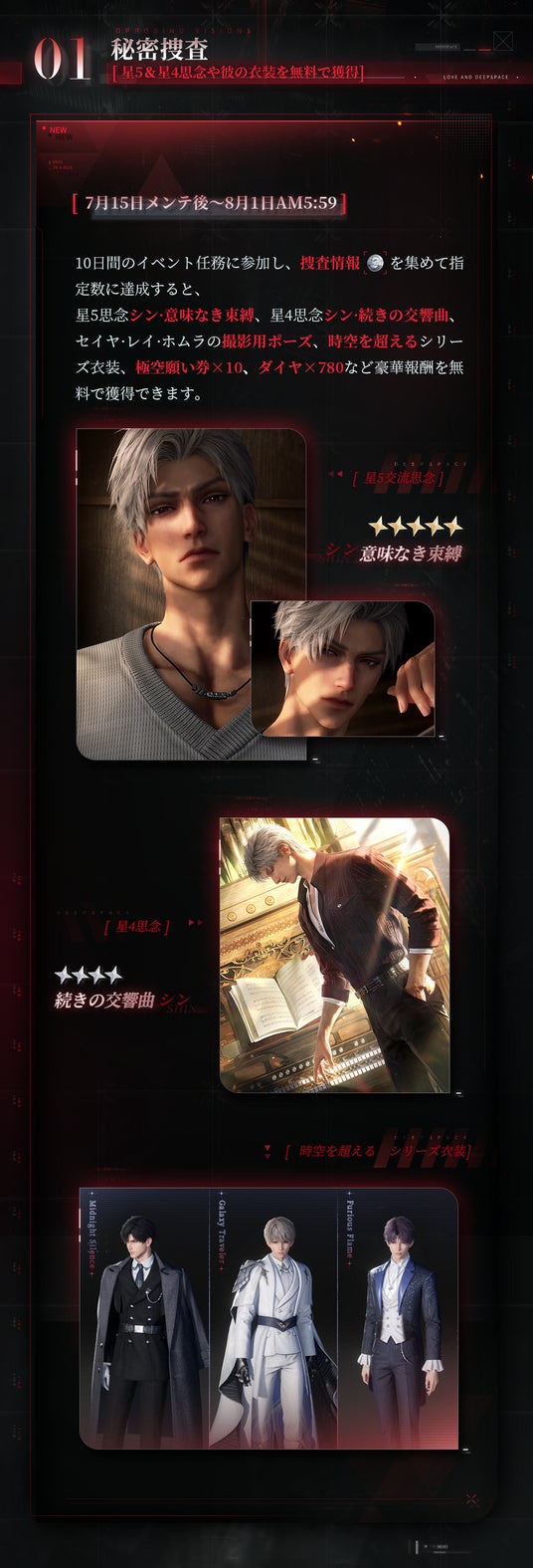 イベント説明:イベントに参加して任務を達成すると、星5思念【シン・意味なき束縛】、星4思念【シン・続きの交響曲】、セイヤ・レイ・ホムラ撮影用ポーズ、【時空を超える】シリーズ衣装、【ダイヤ×780】など豪華報酬を無料で獲得できます。