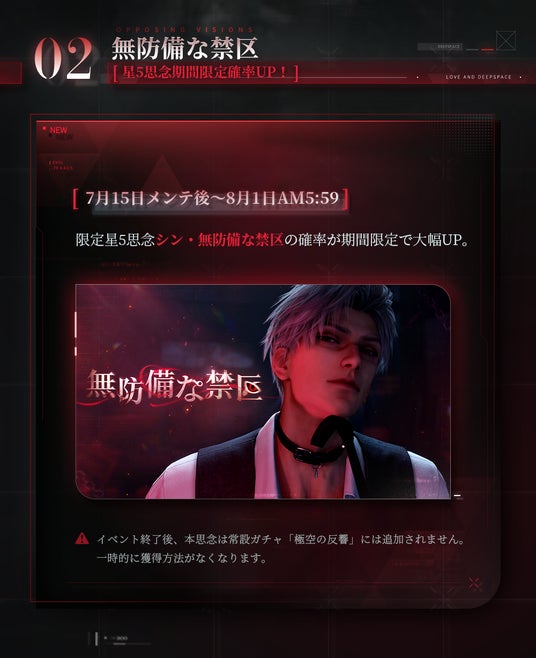 イベント説明:イベント期間中、限定星5思念【シン・無防備な禁区】の獲得確率が期間限定で大幅にアップします。