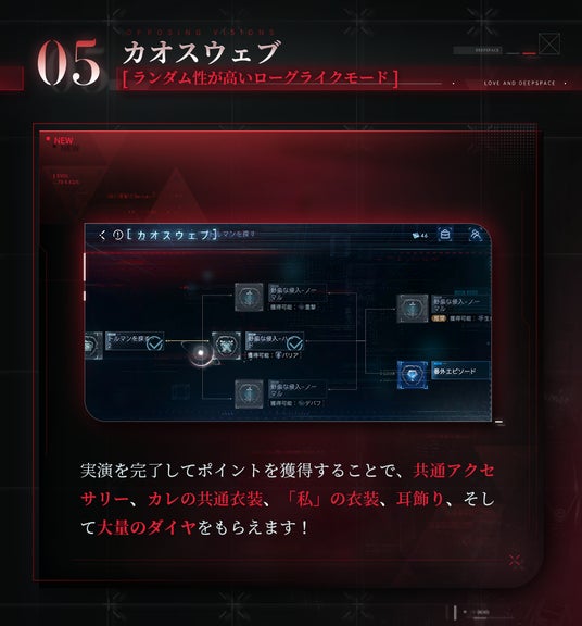 メンテナンス後、新たな戦闘モード【カオスウェブ】が正式に登場します。 実演をクリアしてポイントを獲得すると、カレの共通衣装、「私」の衣装、共通アクセサリー、極空願い券、深空願い券および大量のダイヤなどの報酬を受け取ることができます。