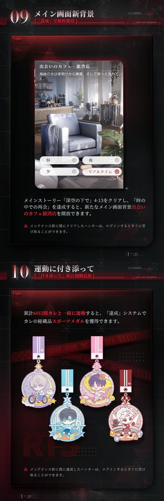 メンテナンス後、メインストーリー【深空の下で】4-13をクリアすると、達成項目【時の中での再会】をクリアすることができます。報酬として、新たなメイン画面背景【出会いのカフェ・銀湾店】を獲得することができます。