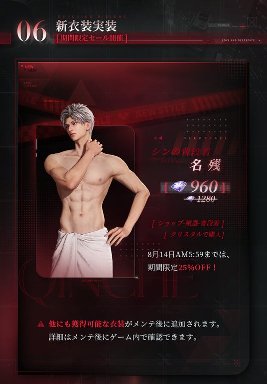 8月14日(水) AM 05:59までは、期間限定25%OFFで購入可能です。 さらにシンの他の普段着、「私」の新しい普段着もショップに追加されます。詳細はメンテナンス後の「ショップ画面」よりご確認いただけます。