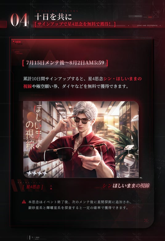 イベント説明:イベント期間中、累計10日間サインアップすると、星4思念【シン・ほしいままの視線】や極空願い券、ダイヤなどを無料で獲得できます。