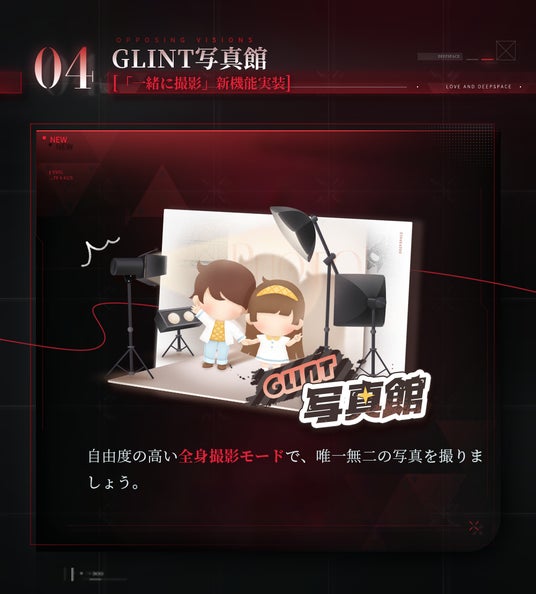 メンテナンス後、【一緒に撮影】の新機能【Glint写真館】が開放されます。 照明、シーン、ポーズを思いのままに変更して、カレと一緒に二人だけの唯一無二の写真を撮りましょう。