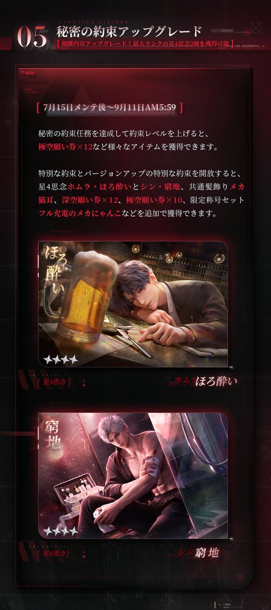 イベント説明:秘密の約束が更新され、最大報酬が最大ランクまでランクアップ可能な星4思念2種にアップグレードされます。 秘密の約束任務を毎日達成して約束レベルを上げると、様々なアイテムを獲得できます。 特別な約束とバージョンアップ特別約束を開放すると、星4思念【ホムラ・ほろ酔い】、【シン・窮地】、共通髪飾り【メカ猫耳】などを追加で獲得できます。