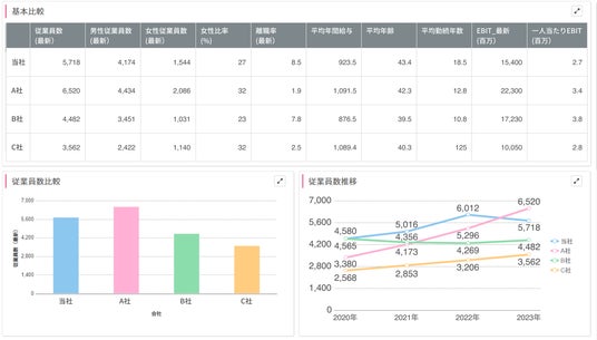 女性管理職比率、男性の育児休業取得率、男女間賃金格差、役員等報酬といった代表的な人的資本指標に加え、研修時間や勤続年数等の情報も把握でき、企業の経営層・人事部等が、他社動向をモニタリングした上で業績指標を設定し、人事業務のPDCAサイクルを回すことを支援します。