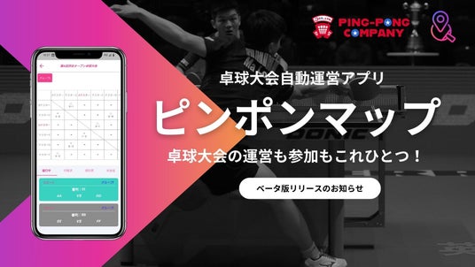 卓球のスタジオ事業やレッスン事業を展開する株式会社 PING-PONG COMPANYは、卓球大会の開催・運営・参加がスマホひとつで完結できるスマホアプリ『ピンポンマップ』β(ベータ)版をリリースしました。※8月上旬~正式リリース予定