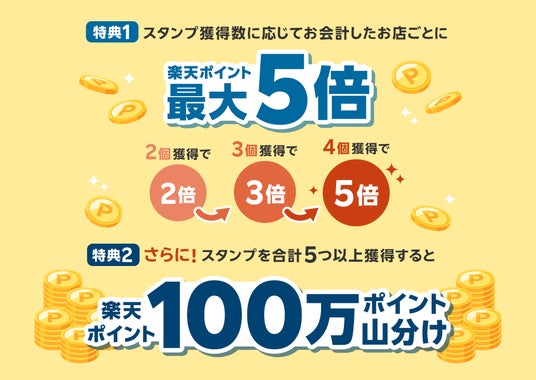 さらに、スタンプ獲得数が合計5つ以上の方は、「楽天ポイント」100万ポイントが山分けで進呈されます。