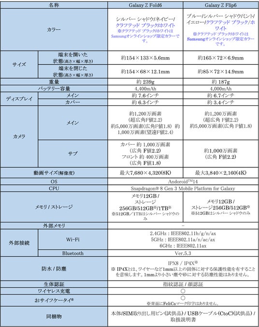 <主な仕様 : 「Galaxy Z Fold6」「Galaxy Z Flip6」 (SIMフリーモデル)>