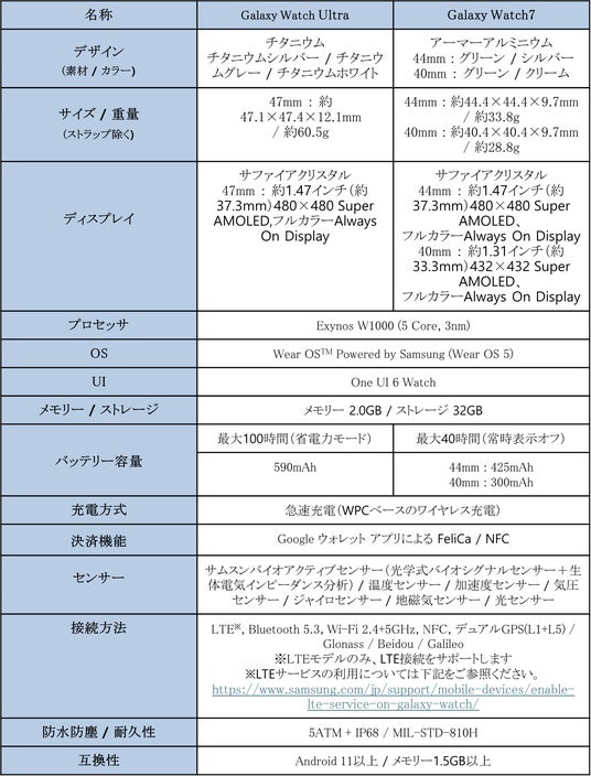 <主な仕様 : 「Galaxy Watch Ultra」「Galaxy Watch7」>