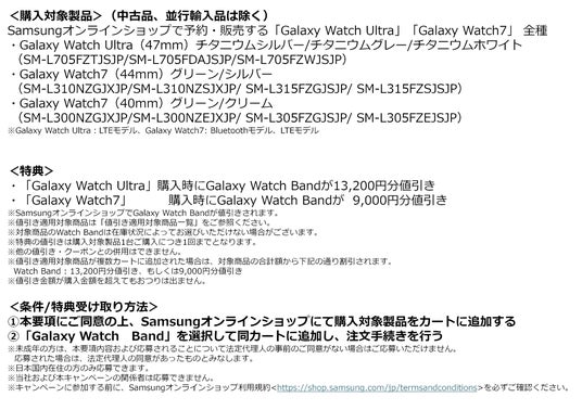 対象期間中に「Galaxy Watch Ultra」「Galaxy Watch7」をご購入・ご応募いただいたお客様全員に、Samsungオンラインショップ(https://www.samsung.com/jp)にて「Galaxy Watch Band」をオトクに購入できる「発売記念キャンペーン」※を開催いたします。