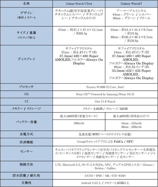 <主な仕様 : 「Galaxy Watch Ultra」「Galaxy Watch7」(LTEモデル)>