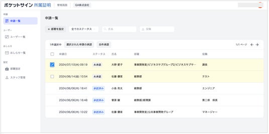 管理側の画面(申請を承認、ユーザー一覧も確認でき、通知も送信可能)