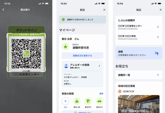「ポケットサイン防災」では、あらかじめマイナンバーカードを使って「ポケットサイン」にユーザー登録しておくと、二次元バーコードを読み込むだけで、瞬時に避難所受付時の本人確認が終了します。この受付記録は管理者用の管理画面にリアルタイムに反映され、避難所本部で、従業員のいつ・だれが・どこにチェックインしたのかを正確かつ簡単に把握することが可能です。
