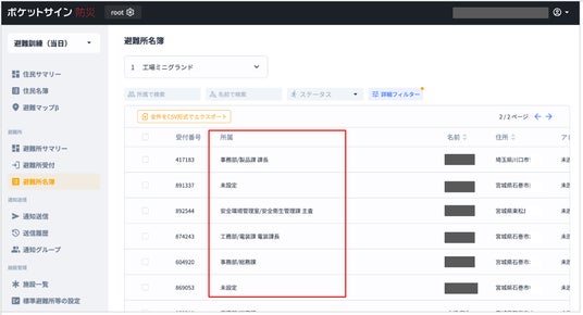 「ポケットサイン防災」の管理画面(所属が反映される)