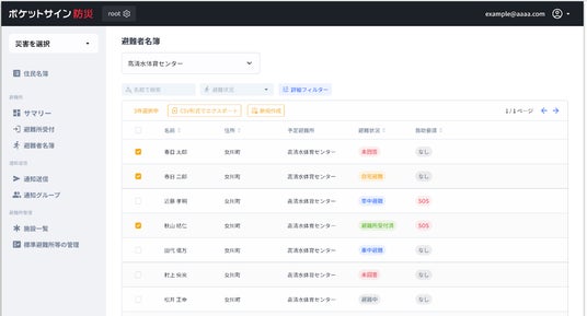受付が完了すると管理側では避難者名簿の一元管理ができる