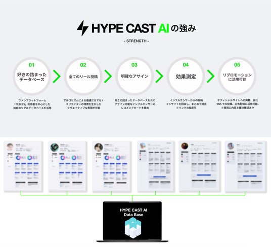 この度、正式リリースした、”HYPE CAST AI”β版では、AI技術とファンプラットフォーム「PEEEPS」で得たゼロパーティーデータを活用し、タレントのリアルな"好き"と商品やサービスのマッチングを実現します。これにより、タレントのSNSの情報からだけではわからない本当に興味関心がある商品やサービスと企業のキャンペーンをマッチングし、タレントの真摯な関与を前提としたマーケティングの実現が可能です。