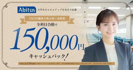 国際資格講座などを展開するパスメイクグループのアビタス(本社東京都渋谷区、代表宇坂純)は、この度、15万円の合格お祝い金をキャッシュバックする、大学生限定 USCPA講座《合格お祝い金制度》を開始しました。合格者数No.1※1 のアビタスが、大学生のUSCPA合格を全力で応援します。