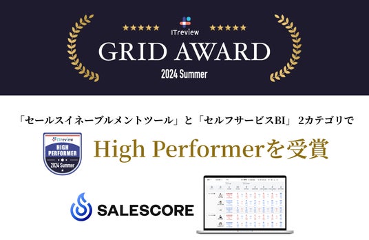 セールスイネーブルメントSaaS『SALESCORE(セールスコア)』と強い営業組織の構築支援に特化したコンサルティング事業を展開するSALESCORE株式会社(本社:東京都渋谷区、代表取締役:中内崇人、以下:当社)は、B2B向け IT製品/SaaSのレビュープラットフォーム「ITreview」が顧客満足度の高い製品を表彰するITreview Grid Award 2024 Summerにて、「セールスイネーブルメントツール」カテゴリーと「セルフサービスBI」カテゴリーで6期連続High Performer賞を獲得したことをお知らせします。