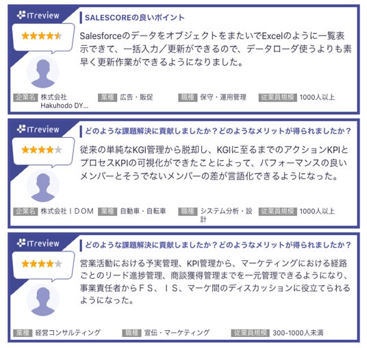 「SALESCORE」のご利用企業様からは、ITreviewにて以下のようなレビューをいただいています。(一部抜粋)