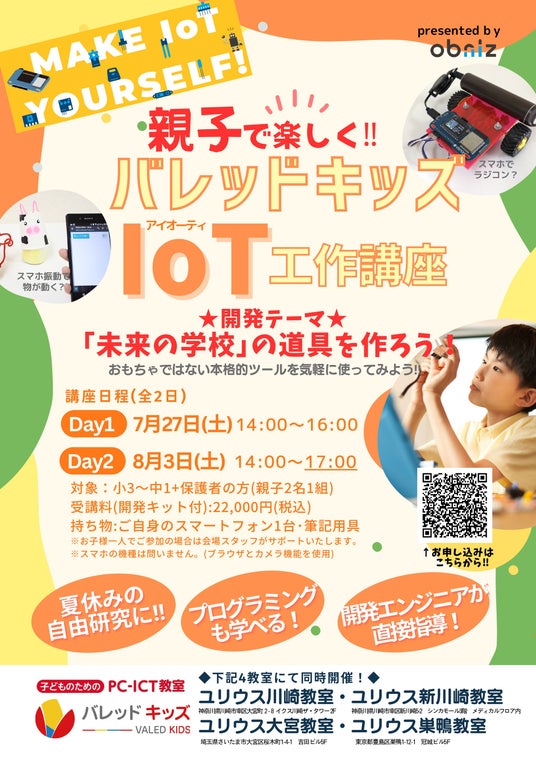 「時代の変革点における最良のパートナー」である株式会社グローバルキャスト(所在地 愛知県名古屋市中村区、代表取締役 川口 英幸) は、株式会社obniz(所在地 東京都豊島区、代表者 佐藤 雄紀)と協業し、自社教育事業のひとつである、子ども向けパソコン・プログラミング教室「バレッドキッズ」にて、7月27日(土)より「バレッドキッズIoT工作講座」(全2回)を開催いたします。