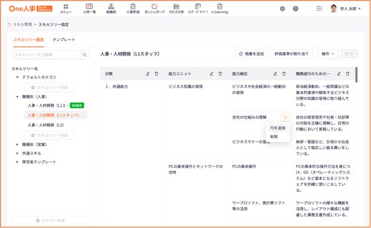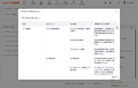 ▲スキルテンプレート画面:今回提供するスキルテンプレートは、厚生労働省のサイトにて公開されている「職業能力評価シート(事務系職種)」(https://www.mhlw.go.jp/stf/seisakunitsuite/bunya/0000093991_00001.html)を参考に、能力系スキルと知識系スキルの両方に対応しております。また、誤字脱字の修正や用語の統一などを加えて提供しております。