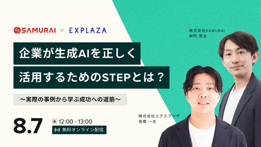 企業の生成AI活用を支援する「EXPLAZA 生成AI Partner」を運営する株式会社エクスプラザは、2024年8月7日12時から、株式会社SAMURAIと共催ウェビナーを開催します。