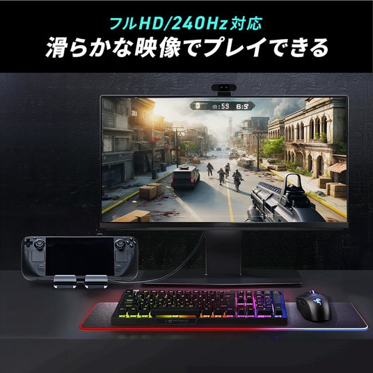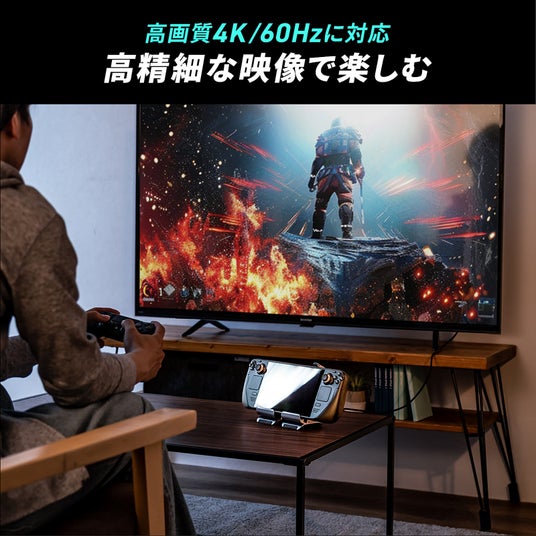 ポータブルゲームPCを、リビングの大型テレビで高画質のままプレイできます。最大解像度は4K/60Hzに対応し、フルHDの場合は240Hzの高リフレッシュレートに対応しています。