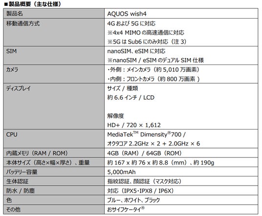 ■「AQUOS wish4」製品ページ