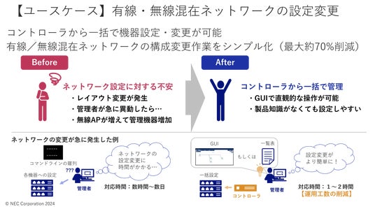 また、統合管理では、有線・無線混在のネットワークでもコントローラから一括で機器の設定や変更ができるようになり、ネットワークの構成変更作業をシンプル化することで従来に比べて対応時間を最大約70%削減(注2)することが可能です。さらに、監視機能やレポート機能によりネットワークの構成や状況を直感的に把握することもでき、設定変更時や障害発生時の対応の迅速化にも貢献します。