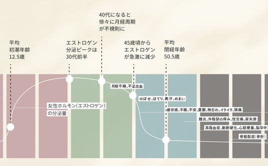 女性の美と健康をつかさどる女性ホルモンの分泌は、30代前半をピークに徐々に減少していきます。加齢とともに卵巣の機能が低下し、それにより、今まで女性ホルモンによって調節されていた、さまざまな身体の機能がうまく働かなくなり、心身の不調を感じるようになります。