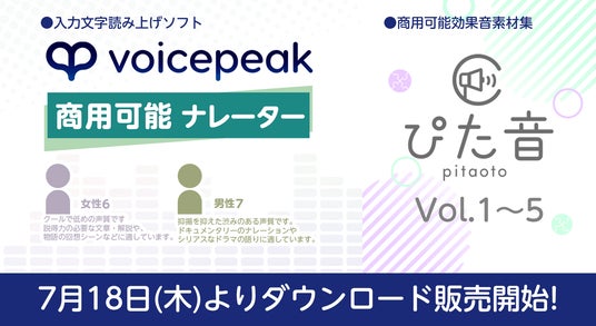 『VOICEPEAK 商用可能 ナレーター』女性6/男性7、商用可能素材集『ぴた音』販売開始