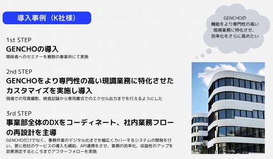 株式会社RTプロジェクト(本社:名古屋市西区、代表取締役社長:城山朝春)は、業務効率化サブスクリプションサービス『GENCHO』を提供しておりますが、更なる事業拡大に向け、DX(デジタルトランスフォーメーション)戦略コンサルティングサービスの提供を開始しました。本サービスは、経営現場に寄り添い、最適なDX導入戦略を共に立案、導入、定量的成果を出すことを目的としています。