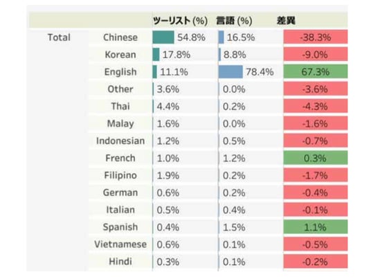 主要言語を話せるスタッフの在籍率よりもその言語を話す訪日客率(観光客率)の方が高い事を示唆している。2023年12月WASIMIL調べ