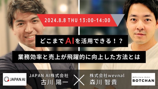 株式会社wevnal(本社:東京都渋谷区、代表取締役社長:磯山 博文)とJAPAN AI株式会社(本社:東京都新宿区、代表取締役社長:工藤 智昭、以下JAPAN AI)は、2024年8月8日(木)に共催オンラインセミナーを開催します。