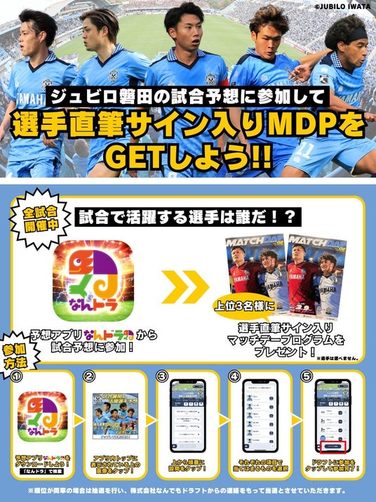 イノベーションの力で新たなスポーツ・エンターテインメントを創造し、まだ見ぬ感動と熱狂を提供するアプリ「なんドラ」を運営する株式会社なんでもドラフト(本社:東京都渋谷区、代表:森井啓允)は、7月20日(土)にヤマハスタジアムで開催の明治安田J1リーグ 第24節 京都サンガF.C.戦のジュビロ磐田公認 試合展開・活躍選手予想を行います。