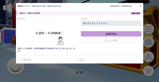 宝箱の問題には、言葉あそびのような「ナゾナゾ」から、企業情報・地域の歴史や文化に関する知識を問う「クイズ」、学校の試験問題のような「学習問題」など、多様なカテゴリの「問い」を設定することができます。没入感溢れるメタバース空間で様々なクエストに挑戦していくことで、ゲームのように楽しみながら新しいスキルや知識を得る、地域の魅力を知るといった「新たな発見」に出会える場をプレイヤーに提供することが可能です。